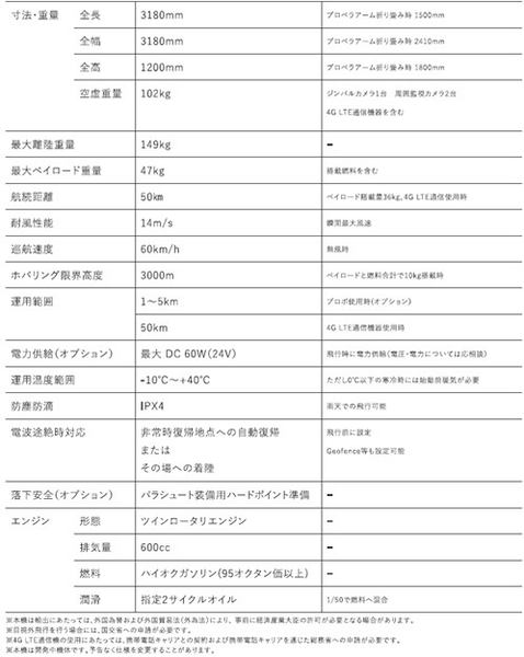 同機体は、ガソリン・ロータリーエンジンと電気モーターにより飛行するハイブリッドドローンで、マルチコプター型ドローンとして最大クラスの可搬重量と飛行時間を実現した。現在、試作2号機により、自動運行および長距離通信機能を検証するため飛行試験を実施している。