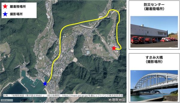 この実証実験では、すさみ町の防災拠点の一つである防災センターを離着陸場所として、緊急輸送道路上にあるすさみ大橋まで往復約8kmの距離をドローンが自動飛行し、すさみ大橋を高精細カメラで撮影して破損の有無などの状況を確認した。