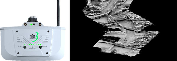 ソフトバンクと技術提携しているアミューズワンセルフが提供する、グリーンレーザー技術を活用したドローン向けレーザースキャナー「TDOT 3 GREEN(ティードット・スリー・グリーン)」で3次元測量を行い、高精度な3次元地図を作成した。TDOT 3 GREENは、発射レート60,000Hz/sのレーザーを照射可能なため、広範囲にわたって高密度な点群データを取得できるほか、水に吸収されにくい特性を持ったグリーンレーザーにより、これまで近赤外線では測量が困難だった雨にぬれた地面や水中の地形(水深数メートル程度)でも、正確な点群データを取得して3次元測量を行うことができる。