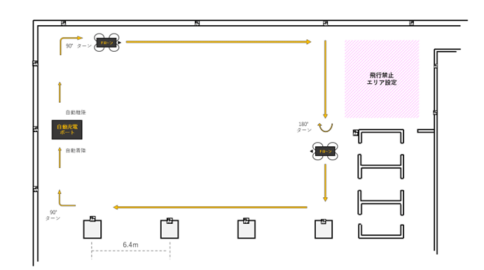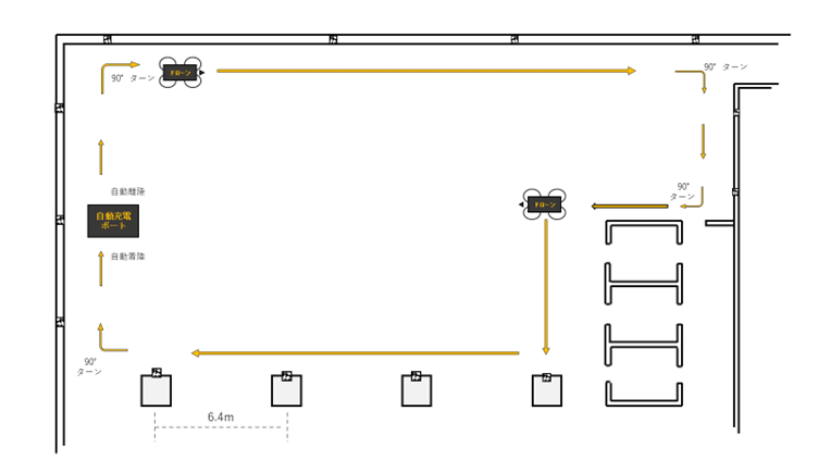 1. 自動充電ポートからドローンが離陸、貼ってあるマーカーを読み設定されたルートを正しく一周して充電ポートに戻り自動充電、画像と動画を転送。