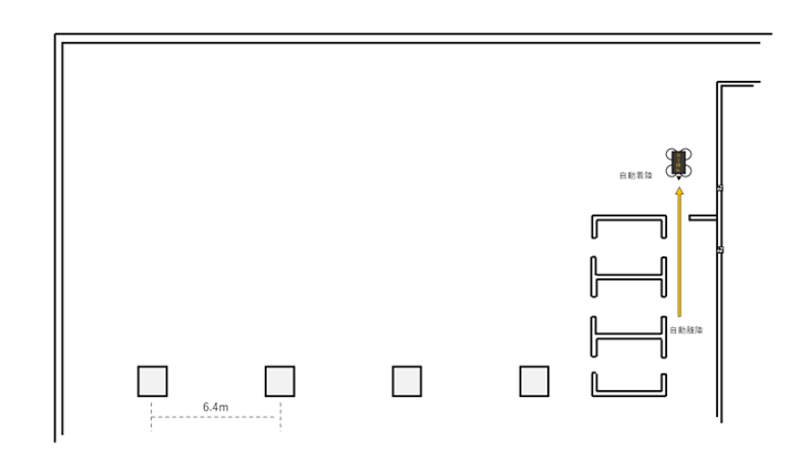 3. ドローンが離陸し、幅2mの通路を飛行後、ドア開口部90cmの狭小空間を通過。
