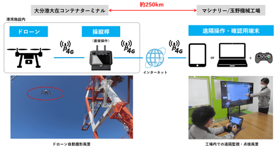 実証実験は、4G(LTE)回線を利用したドローンの遠隔操縦技術とドローン自動飛行によるクレーン点検技術を組み合わせ、遠隔地からの目視外飛行にて、ドローン自動飛行によるリアルタイムでの映像確認および画像撮影を実現する「遠隔ドローン自動飛行点検」の技術検証、実用化に向けての課題解決に向けた検証を目的に、大分県大分港 大在コンテナターミナル内の港湾クレーンにおいて、2022年3月14日〜17日に実施した。