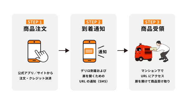 利用者は注文アプリやウェブサイトより注文を行う。複数店舗の商品の同時注文は不可。配送料は一律330円(税込)。支払いはクレジットカード決済のみ。ロボットの到着をプッシュ通知で知らせ、指定したロボット停止位置で商品を受け取る。