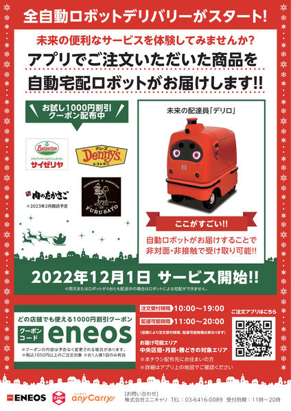 ENEOSホールディングス(以下、ENEOS)とZMP、エニキャリは、東京都中央区佃・月島・勝どきエリアにおいて、2022年12月1日より、自動宅配ロボット「デリロ」を活用したデリバリー事業の実証実験の第3弾を実施する。