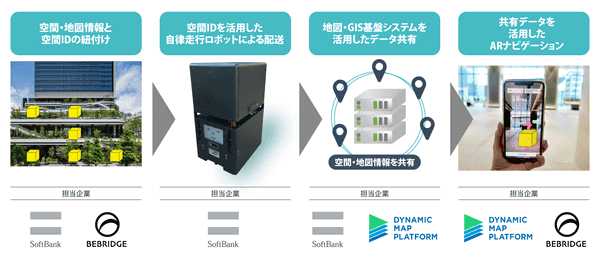 2023年4月25日、ダイナミックマッププラットフォーム、ソフトバンク、ビーブリッジの3社は、デジタル庁から受託した「デジタルツイン構築に関する調査研究」の一環として、空間IDを活用した配送ロボットとARナビゲーションのデータ共有に関する実証実験を、2023年2月に実施したことを発表した。
