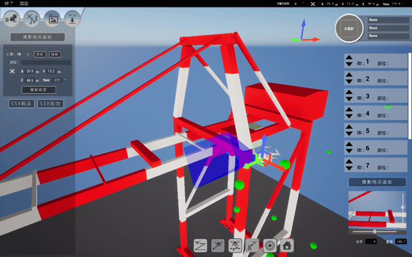 同アプリは、対象物の3Dモデルを読み込み、CG上で点検・巡視の際に確認すべき箇所に対して、事前に撮影したい画像の画角やズーム倍率を設定できる。事前設定した情報は、ドローンの自動飛行ファイルとしてアプリからファイル出力が可能。このファイルに対応するドローンに読み込ませることで、CG上で事前に設定した通りの自動飛行・自動撮影を行う。