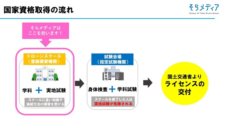 2023年7月1日、中京テレビ放送は、ドローンスクール「そらメディア」において国家資格取得コースを8月に開講することを発表した。7月1日より予約受け付けを開始する。二等無人航空機操縦士の講習から開始し、一等無人航空機操縦士については秋頃に開講する予定だという。