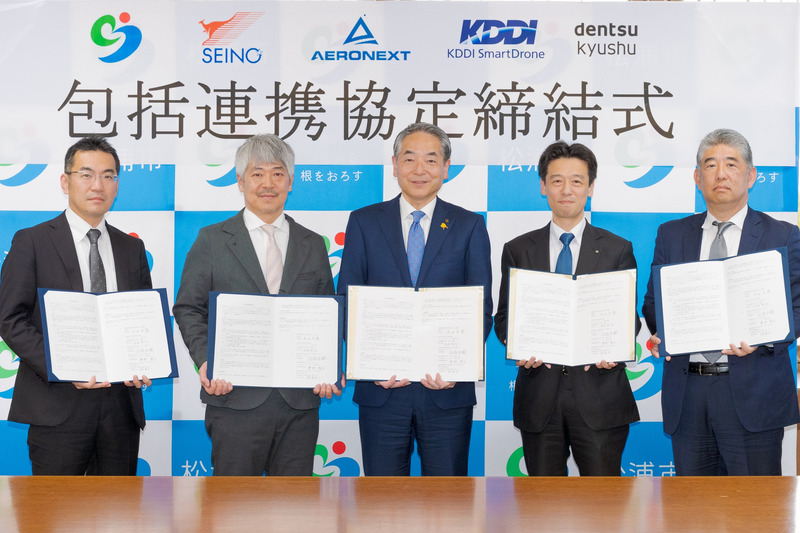 長崎県松浦市とセイノーホールディングス(以下、セイノーHD)、エアロネクスト、KDDIスマートドローン、電通九州は、2024年2月27日、ドローンを含む次世代高度技術の活用による地方創生に向けた連携協定を締結した。