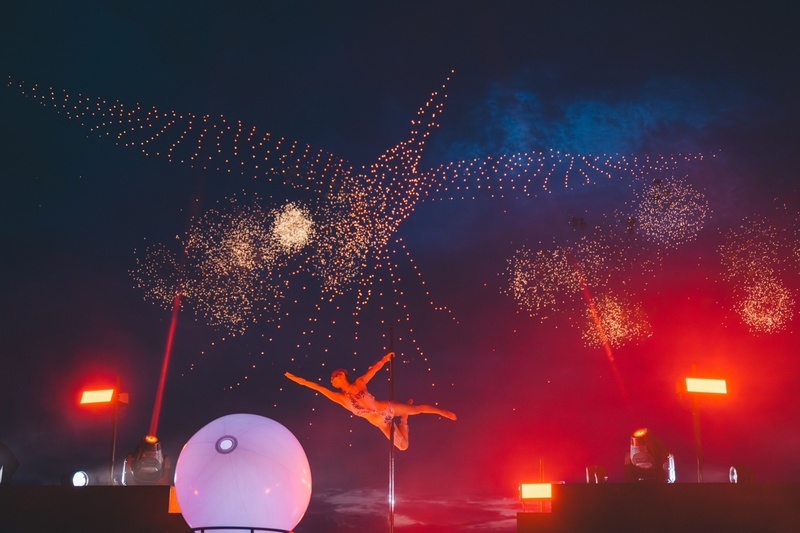 レッドクリフ代表の佐々木孔明氏とSky Studio主宰の小橋賢児氏とのコラボレーションとなる今回は、1000機のドローンを投入して日本の伝統花火やパフォーマンスを融合した演出を行った。