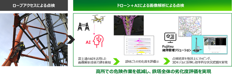 ドローンに搭載した高解像度カメラを用いて通信用鉄塔の外観を撮影。富士通のAIによる画像解析技術でドローン画像からさびの箇所を抽出し、建設電気技術協会が定める点検要領規定の基準により劣化度を4つのレベルに区分した。