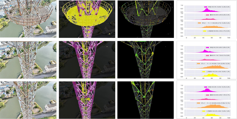 実証の結果、従来の目視点検のみでは困難だった鉄塔全体の劣化度の定量的な評価を実現。これらのデータを活用することで、将来的な劣化進行予測も可能になることが期待される。
