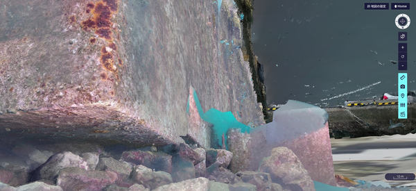 さらに、従来の潜水士等による水中インフラ点検で課題となっていた、対象物の正確な位置、寸法や面積の把握をデジタルツイン空間において可能とした。