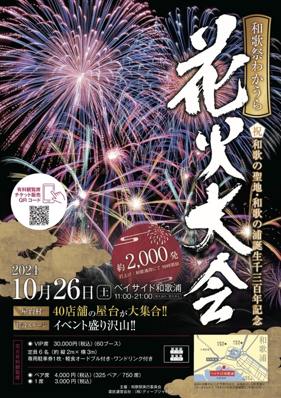 この花火大会は、和歌の浦誕生1300年を記念し、地域の魅力と誇りを未来へつなぐことを目的に、2024年10~11月にかけて「和歌の聖地・和歌の浦誕生千三百年記念大祭」として開催されるイベントのひとつ。和歌浦湾に約2000発の花火が打ち上がる。