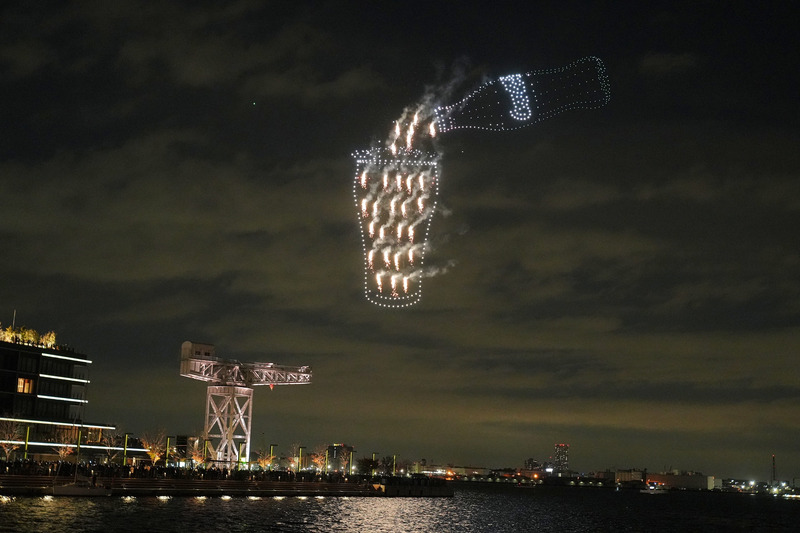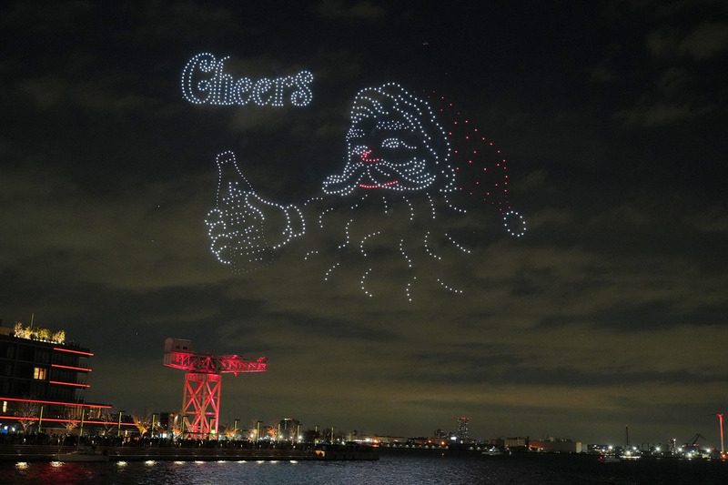 当日はクリスマスの12月25日にちなみ、1,225機のドローンが“乾杯”をテーマに夜空を彩る演出を展開。音楽に合わせドローンがLEDライトの光を変えながら飛行し、夜空にさまざまなモチーフを描いた。