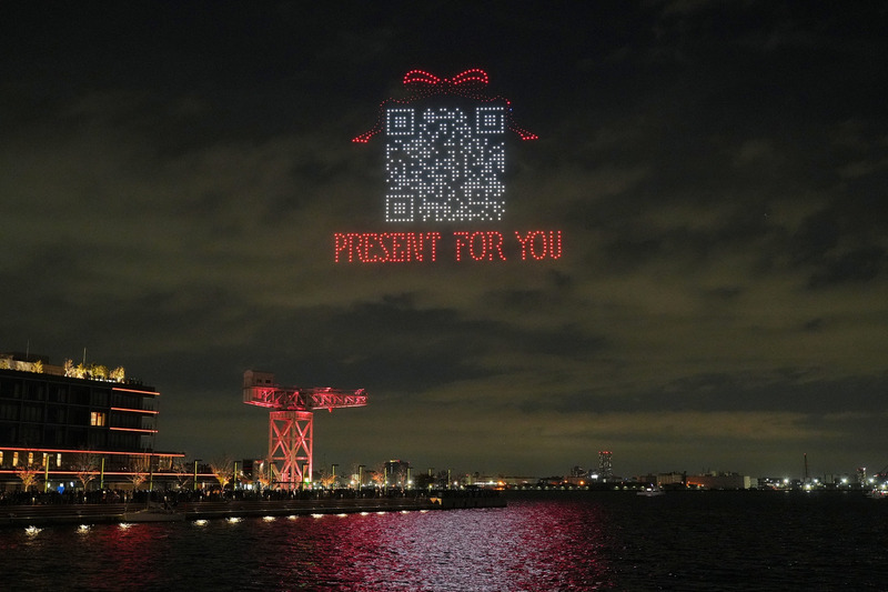 約15分間のショーの最後には、QRコードが出現。来場者がスマートフォンで読み取ることで、先着1万人にプレゼントを贈る仕掛けを用意した。