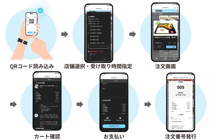 QRコード読み込み→店舗選択・受け取り時間指定→注文画面→カート確認→支払い→注文番号発行