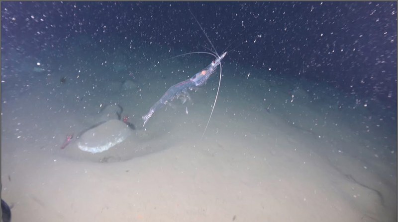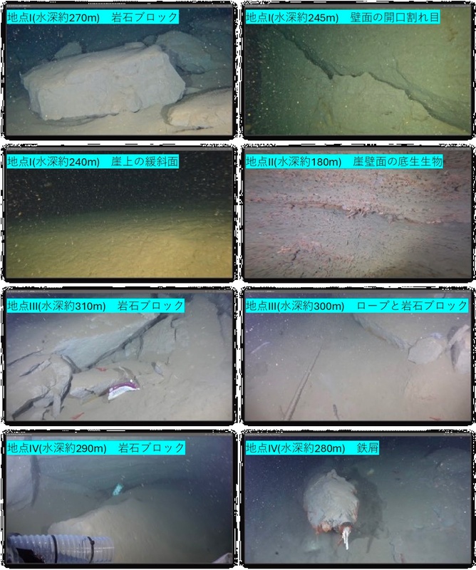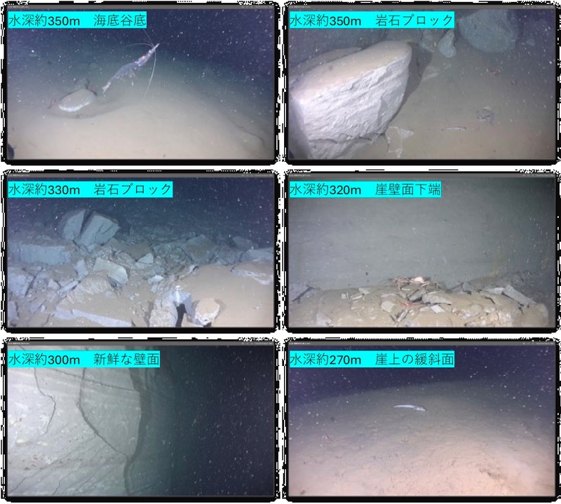 海底谷底(水深約350m)では、比較的平坦な地形を細粒で軟らかい堆積物が覆い、シラエビやゲンゲなどが生息する様子を観察した。西向きの海底斜面の下端付近(水深約350~330m)では、ブロック状に砕けた岩石(後述する海底斜面の壁面に露出した陸源性砕屑岩(さいせつがん)層に由来)が散乱し、海底斜面(水深約350~270m)では、陸源性砕屑岩層が露出した落差数十mに及ぶほぼ垂直な崖が連続する様子を確認した。ブロック状の岩石や砕屑岩層は半固結状態と判断でき、その断面は新鮮で、谷底で観察されたような細粒物質の堆積はごく少なく、付着生物はほとんど認められなかった。崖の上(水深約275m以浅)では、緩斜面を細粒物質が覆い、海底の堆積物には巣穴と思われる穴が多数あり、ゲンゲやクモヒトデなどが生息する様子を認めた。