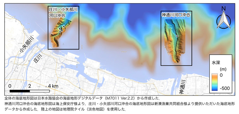 2025年1月16日、富山大学は、2024年10月24日から12月4日のうち5日間、神通川河口沖合および庄川・小矢部川河口沖合において、海底斜面の水中ドローン探査を実施し、多数の「海底地すべり」の痕跡を直接撮影することに成功したと発表した。この調査は富山大学が主導し、京都大学と金沢大学の研究者が参加した。