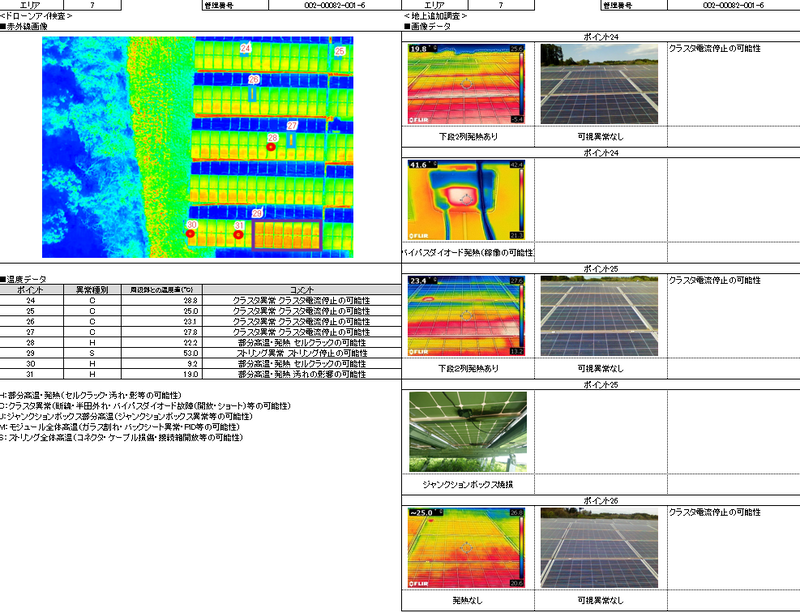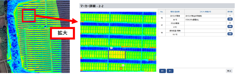 太陽光発電所全体でのモジュールの熱異常発生状況をシームレスに把握できるほか、現地での地上検査支援機能を付加し、その報告書作成作業を効率化する。