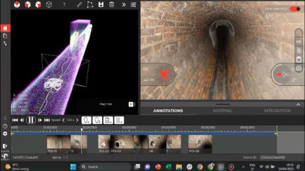 この調査では、GPSが届かない環境でも安定した飛行が可能なFlyability(スイス)社製ELIOS 3を活用し、事故現場の下流約600m付近のマンホールから下水管内の状況を確認した。内部映像とともにリアルタイムに表示される高精度3Dマップにより、調査精度の向上に貢献した。