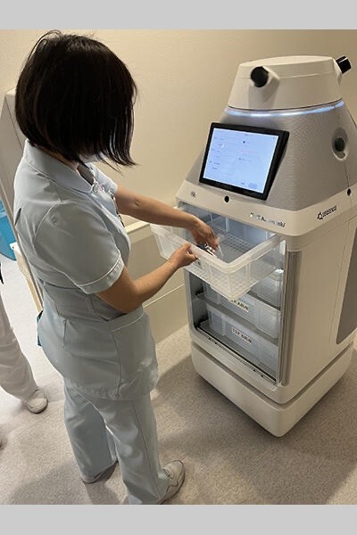 写真:病院スタッフがロボットの引き出しの物品を出し入れする様子
