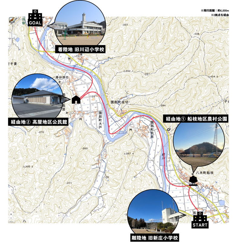 同実証は、災害により収容避難場所である旧川辺小学校から旧新庄小学校をつなぐ陸路がふさがり、孤立状態に陥った場合の山間部への救援物資配送を想定。両避難所を発着地として、入り組んだ山間部に位置する複数経由地へ、ドローンによる物資供給を行う。