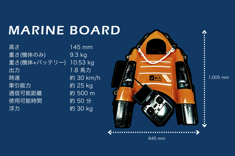 マリンボードは、リモート操作型ボディボードとして設計されており、コントローラーを操作することで遠隔から迅速かつ安全に被災者のもとへ駆けつける。