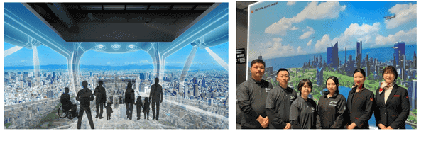 このシアターでは、リアルな映像や立体音響、振動によって、空飛ぶクルマに搭乗しているかのような臨場感を提供し、JALの次世代モビリティが創る未来の空を体験できる。万博期間中は、JALスタッフが特別仕様のスカーフを着用して展示施設内を案内する。