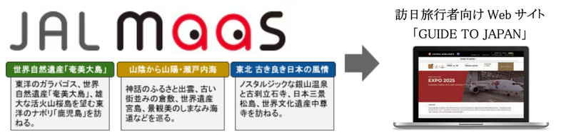 日本各地の魅力が感じられるツアーと訪日旅行者専用のウェブサイト「GUIDE TO JAPAN」を連動し、万博を契機に大阪観光を促進するJAL MaaS大阪周遊バスや日本各地の魅力を訪日旅行者向けに発信する。