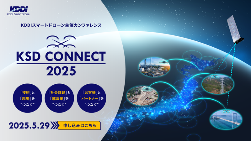KDDIスマートドローンは、2025年5月29日にドローンカンファレンス「KSD CONNECT 2025」を開催する。大手町三井ホール会場とオンライン配信のハイブリッド形式で行う。開催に先立ち、2025年4月17日から「KSD CONNECT 2025」特設サイトで参加登録(無料)の受け付けを開始する。