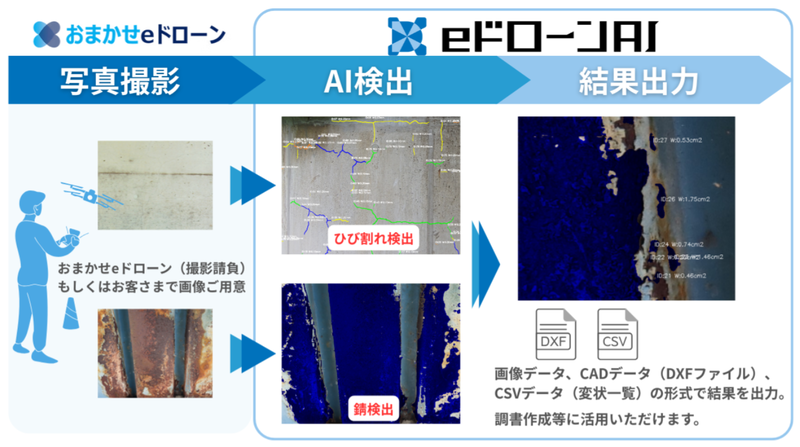 このサービスは、ドローン撮影請負サービス「おまかせeドローン」のオプションであり、ドローンの機体やパイロット派遣だけでなく、撮影後の画像に対してのAI解析まで一気通貫した実施が可能になる。
