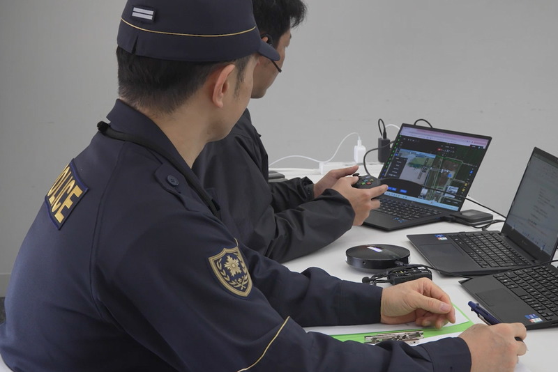 写真:PC画面を見ながらコントローラーを操作する様子、PC画面を見る警察官