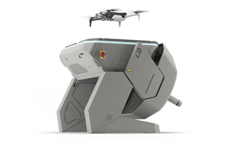 写真:ドローンポート、飛行するドローン