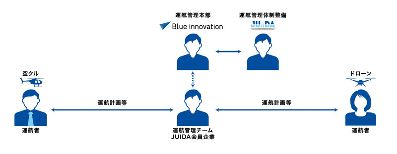 JUIDAはドローンの飛行前の安全管理、ブルーイノベーションは飛行中の安全管理を担当する。