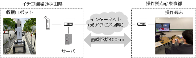 システム構成として、秋田県のイチゴ圃場に収穫ロボットと画像処理用サーバーを設置し、東京都の拠点に操作端末を配置した。両拠点は直線距離で約400km離れており、光アクセス回線とインターネット回線で接続している。この環境で、収穫ロボットを遠隔から精度高く操作し、イチゴを傷つけずに収穫できることを確認した。