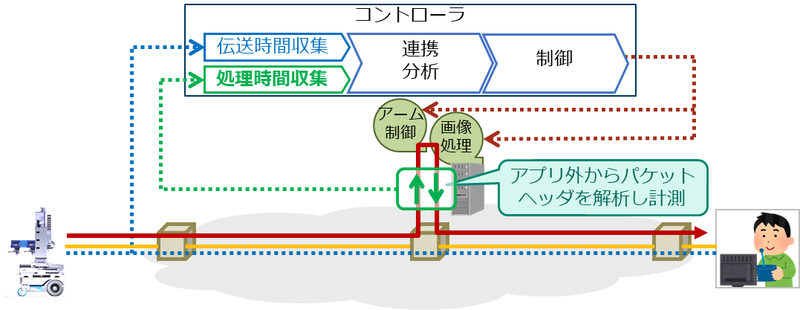 従来は、画像処理アプリに独自機能を追加し、その機能を用いてアプリと連携することで、画像処理時間を計測してした。機能の高度化により、アプリ外から入出力データを汎用画像フレームのヘッダー特性を用いて解析し、データの通過時間から処理時間を計算できるようになった。これにより、画像処理アプリに手を加えずにアプリ外のサーバーのみで処理時間計測を行えるようになる。 - 品質通知によるシステム連携