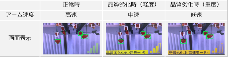 従来は、通信品質が性能要件を満たさない場合、別の経路やサーバー処理に切り替える制御を行っていた。より汎用的な使い方として、通信品質の状態をリアルタイムに遠隔収穫システムに通知し、システム側で制御を行うようにした。この機能では、通信品質を分析し、それを3段階に分類し、遠隔収穫システムへの通知を行う。遠隔収穫システムは、ロボットから操作端末に流れる映像に通信品質を表示し、操作者にタイムリーに通知する。また、ロボットアームを制御する情報に対して通信品質に応じた速度制御を行い、アームを減速または停止させる。これにより、エンドツーエンドでの遅延時間が長くなった場合でも操作者はその状況を把握し、操作上のストレスを軽減することが可能。さらに、遅延時間が長くなると操作精度が低下するが、アームの速度を調整することでその誤差を軽減する。