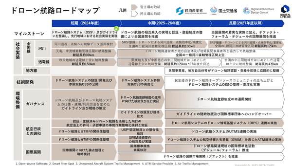 ドローン航路の全国展開に向け、経済産業省とIPA DADCは、2025年5月15日に開催された第2回ドローン航路普及戦略ワーキンググループを踏まえ、ドローン航路ロードマップを策定した。ドローン航路の全国展開は、「デジタルライフライン全国総合整備計画」に基づき、ロードマップに示した社会実装、技術開発、環境整備それぞれのマイルストーンに基づき推進される。