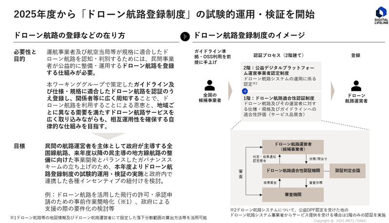 2025年5月19日、経済産業省と情報処理推進機構デジタルアーキテクチャ・デザインセンター(以下、IPA DADC)は、運航事業者および航空当局等が規格に適合したドローン航路を認知・判別するため、民間事業者が公益的に整備・運用するドローン航路を登録するための仕組みである「ドローン航路登録制度」の2026年度開始等に向けたロードマップを策定した。また、制度の開始に向け、ドローン航路登録制度の試験的運用・検証を実施する。あわせて、政府内で連携した各種インセンティブのひも付けを検討する。