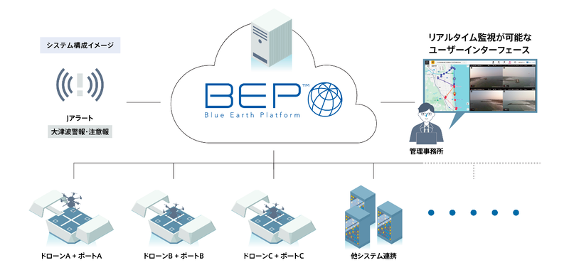BEPポート|防災システムは、ブルーイノベーションが開発したドローンポート情報管理システム「VIS(Vertiport Information System)」を基盤としており、Jアラートと連携することで災害発生時にドローンが自動で発進。広域への避難広報とリアルタイム状況把握を実現し、自治体の防災力向上に貢献する。