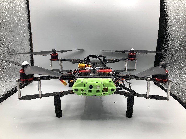 AI画像解析用フライトコントローラー(Modal AI社製「VOXL2」)を搭載したドローンにより、GPSが入らない屋内での自動航行を実現する。