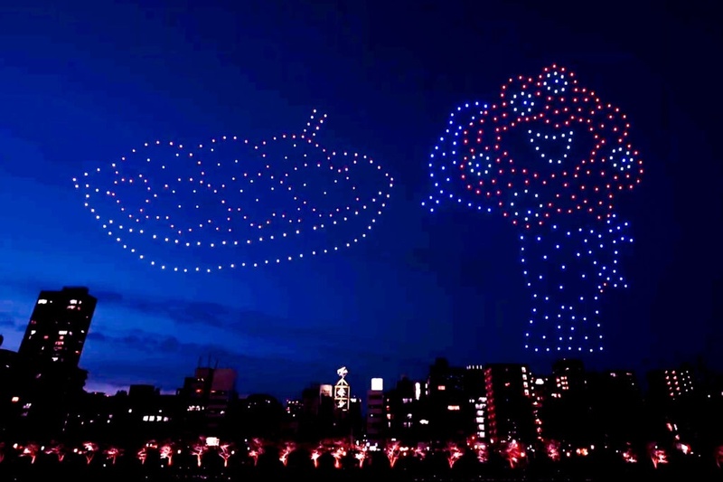 写真:ドローンショーで夜空に描かれた「Twinkling love with PEANUTS」