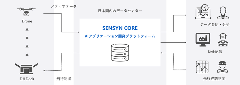 これまでもSENSYN COREは、DJI Dockにより取得した静止画や動画などのメディアを、ドローン着陸後にデータ管理機能を備えた「SENSYN CORE Datastore」へ自動転送し、AI分析やレポート作成などを行っていた。