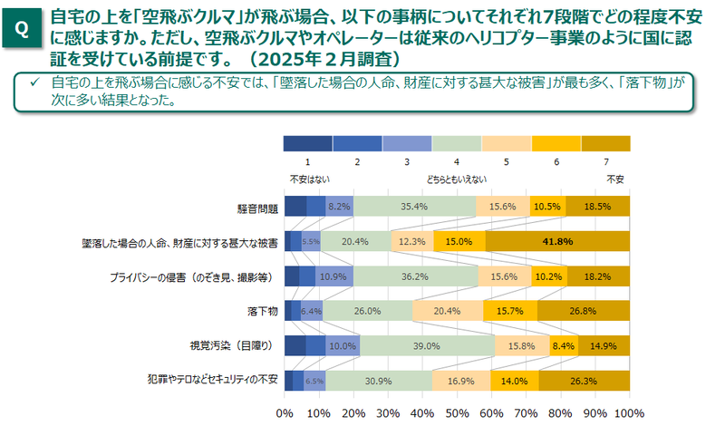 2025年2月の調査では、空飛ぶクルマが実現すると思うと答えた人の割合は44.1%。2020年9月の調査は57.8%、2021年8月は53.1%、2024年2月は49.3%となり、徐々に減少していた。