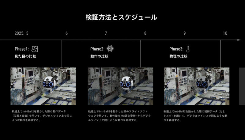 軌道上でInt-Ball2を動かした際のフライトソフトウェアを用いて、動作指令(位置と姿勢)からデジタルツイン上で同じような動作を再現する。 - Phase III:物理の比較