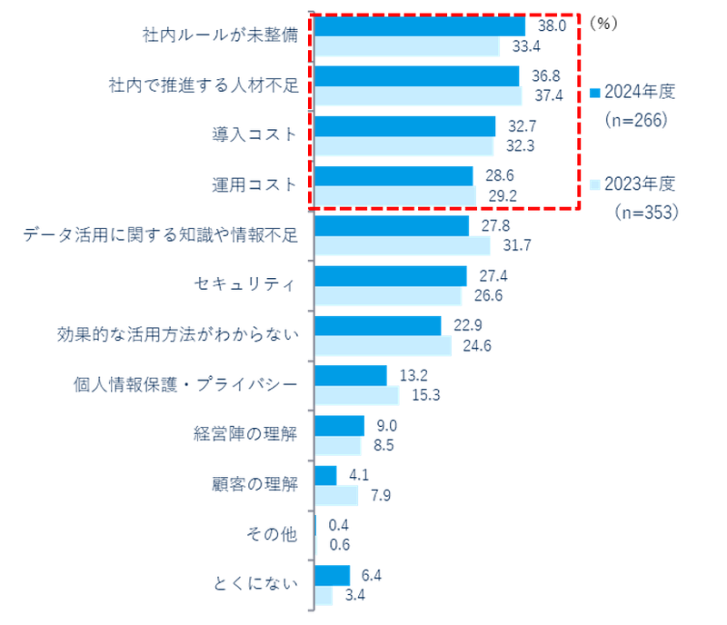 データ活用にあたって、社内ルールの未整備や人材、コスト、知識の不足を課題と挙げる企業が多い
