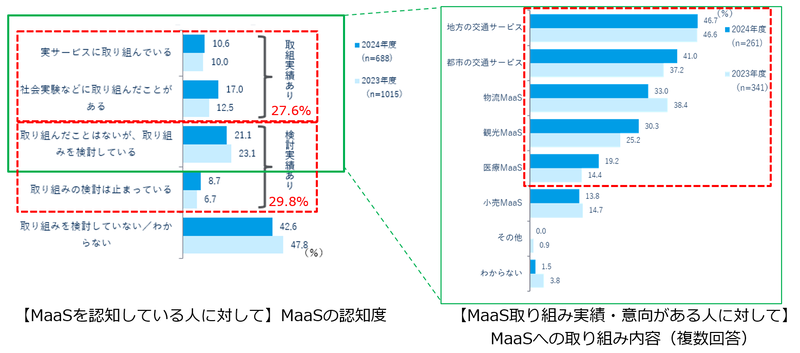 MaaSを「人に説明できる」「概ね理解している」「言葉は聞いたことがある」と回答した688人を対象に、自社での取り組み状況を尋ねたところ、27.6%が「取り組み実績あり」、29.8%が「検討実績あり」という結果であった。さらに、MaaSの「取り組み実績あり」と「取り組み意向あり」と回答した261人を対象に、取り組み内容について聞いたところ、「地方の交通サービス」が46.7%で最も多く、次いで「都市の交通サービス」が41.0%、「物流MaaS」が33.0%と続いた。また、30.3%が「観光MaaS」、19.2%が「医療MaaS」といった地域課題と直結する分野でも導入が進んでおり、昨年比でいずれも増加傾向にあることから、用途の広がりがうかがえる。