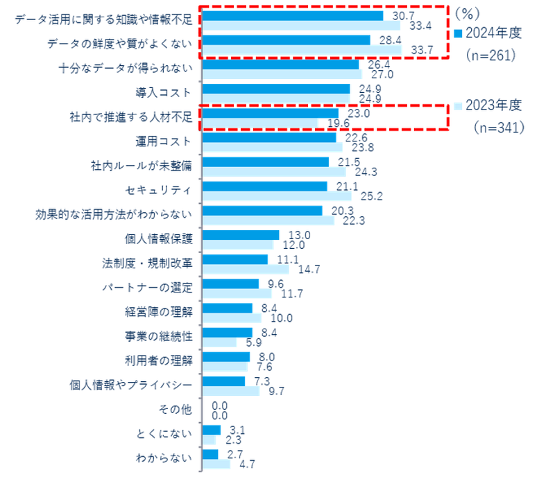 データ活用にあたっての課題は知識や情報不足、データの鮮度や質を挙げる声が多い