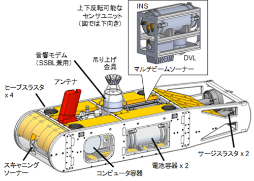 そこで、MONACAが氷海域の深部へ潜入して形状を計測し投入地点まで安全に戻れるよう、マルチビームソーナー(※2)とDVL(ドップラー式対地速度計※3)、INS(慣性航法装置※4)を備えたセンサーユニット、音響測位装置、およびこれらの機器による氷および母船に対する相対ナビゲーションアルゴリズムを実装した。このセンサーユニットは氷を計測する際は上向きで、上下反転することで海底の計測にも対応する。また、複雑な氷裏面の形状に沿って航行できるよう、スキャニングソナーによる障害物回避手法やホバリングのできる高い運動能力を備えている。