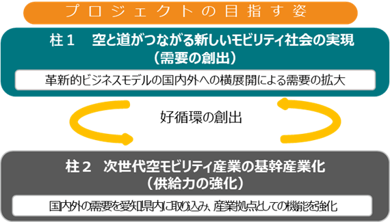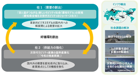 愛知県は、社会課題の解決と地域の活性化を図る官民連携プロジェクトの創出を目指す「革新事業創造戦略」(2022年12月策定)を推進。同戦略の枠組みによる第1号の革新プロジェクトとして、「空と道がつながる愛知モデル2030」(提案者:Prodrone)を採択し、2023年5月に「あいちモビリティイノベーションプロジェクト」を立ち上げた。2024年2月には、プロジェクトが目指す姿や取り組みの柱、ロードマップを示した「推進プラン」を策定。このプランに基づいて、2030年度頃を目標に、次世代モビリティの「需要の創出」「供給力の強化」という2つの柱に沿って、需要と供給が相互に好循環することを目指す。革新的ビジネスモデルを生み出し、そのモデルを国内外へ横展開することで、次世代モビリティの需要を拡大させる。その需要を愛知県に取り込み、産業拠点としての機能を強化させる好循環を創出することで、「空と道がつながる」新しいモビリティ社会「愛知モデル」、次世代モビリティ産業の基幹産業化(「令和の殖産興業」)を実現する。